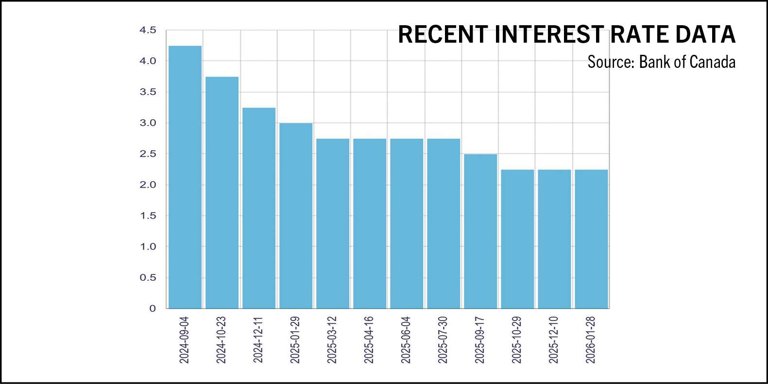 For prospective buyers, the Bank of Canada’s decision to hold steady at 2.25% is an indicator that rates won’t be moving swiftly this year, barring any unforeseen geopolitical circumstances (and who knows what’s coming down the line these days).