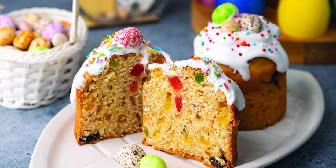 2. Brush or spoon over the tops of the cooled paska, letting the glaze trickle down the sides. Garnish with sprinkles. You can also decorate with extras like jelly beans, candied orange rinds, pastel-coloured macaroons or bit-sized meringues and even edible flowers for a pretty finishing touch.
